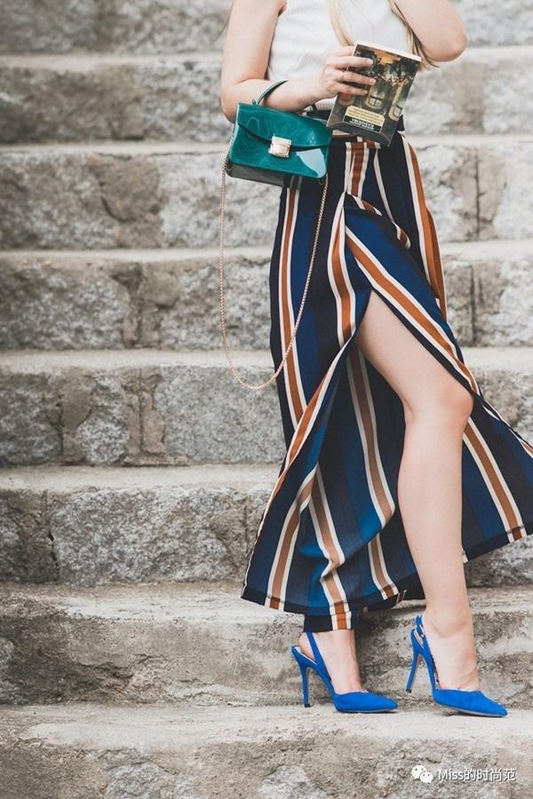 Đường cắt xẻ giúp mẫu quần họa tiết sọc mảnh thêm phần táo bạo cho quý cô công sở.