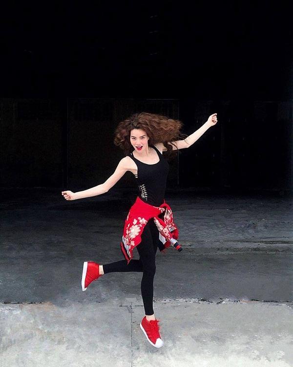Hà Hồ không bỏ qua xu hướng sporty. Điểm nhấn trong set đồ của cô là sneaker đỏ rực với áo khoác thể thao buộc ngang hông.