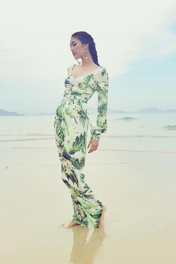 Lan Khuê thả dáng với jumpsuit hoa lá nhiệt đới.