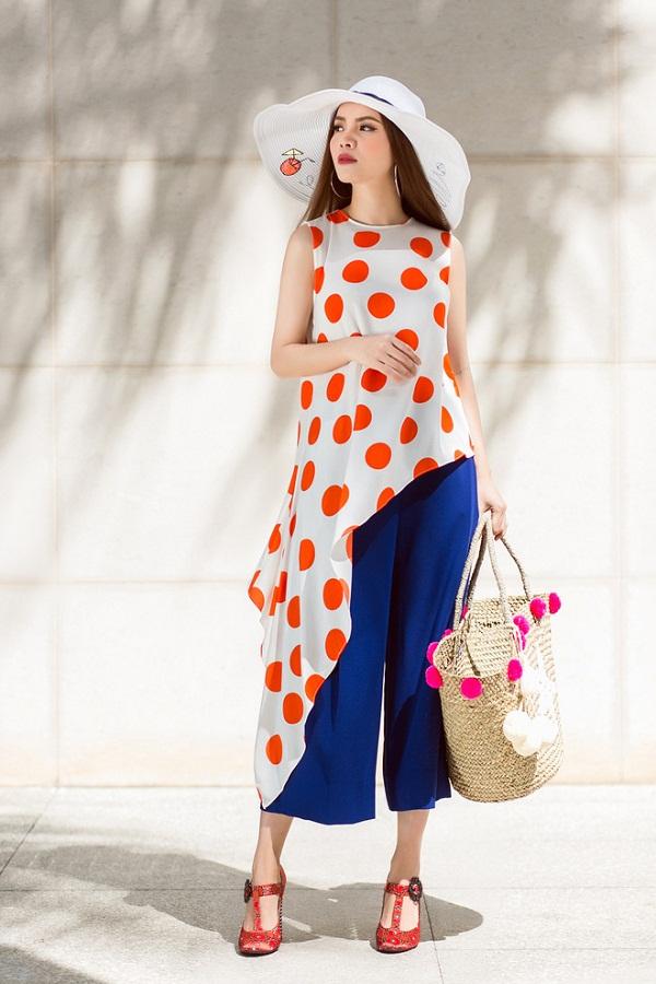 Yến Trang thời thượng với chiếc áo chấm bi oversize và quần culottes xanh biển.