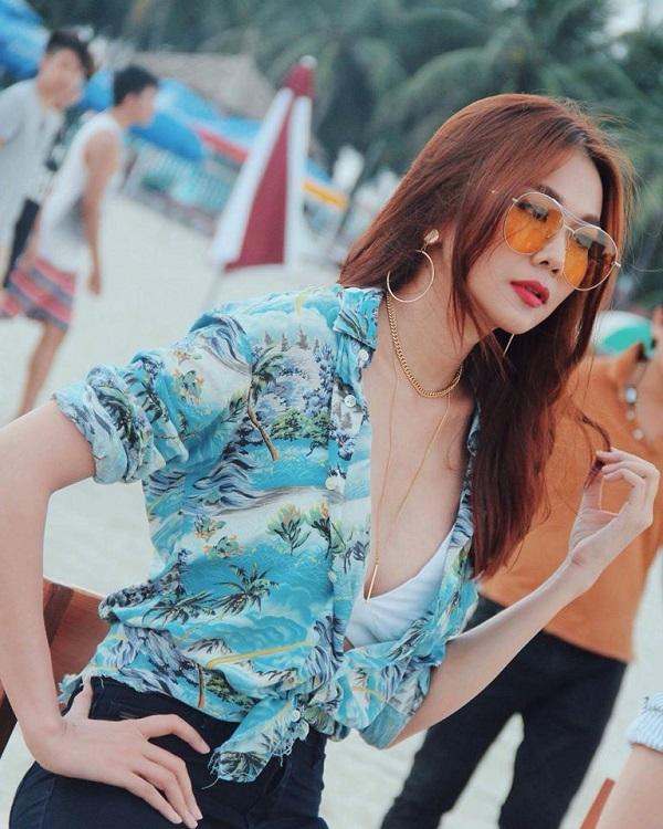 Thanh Hằng đẹp xuất sắc với chiếc áo đậm màu sắc Hawaii với bãi biển và cây dừa.