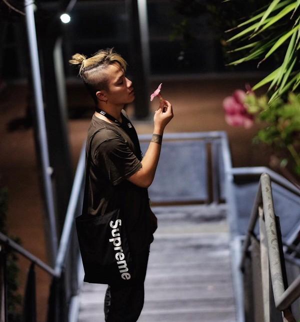 Bạn nam diện nguyên cây all-black nhưng lại chọn túi tote da lộn màu nâu làm điểm nhấn.