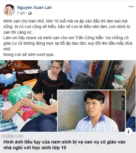 Xuân Lan bày tỏ sự đồng cảm với nam sinh bị lấy nhầm ảnh minh họa trong vụ "vào nhà nghỉ với cô giáo", mở đầu cho tin sao Việt: "Minh oan cho bạn nhỏ. Mới 16 tuổi mà vạ ập vào đầu thì làm sao mà sống. Ai có con cũng sẽ hiểu, bảo vệ con là điều nên làm, con mình bị oan thì càng ức. Làm ơn hãy share và minh oan cho em Trần Công Mẫn. Vợ chồng cô giáo cư xử không đúng mực lại đổ ập đạo đức suy đồi lên đầu mấy đứa nhỏ. Mong con sẽ sớm vượt qua".