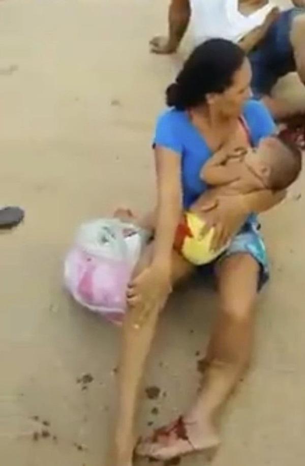 Người mẹ dù bị thương nặng vẫn quyết tâm cho con bú.