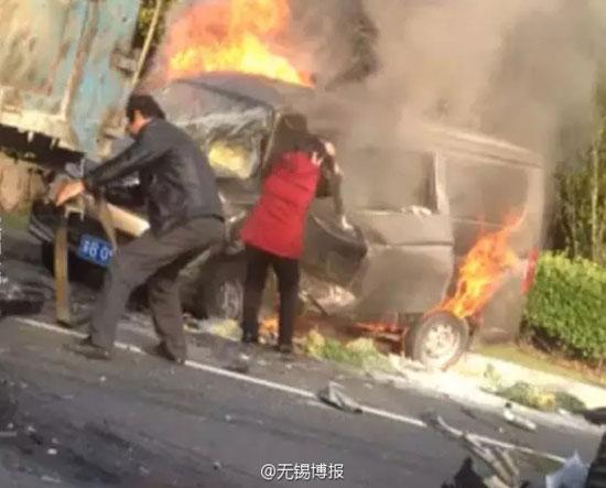 Theo kênh truyền hình tỉnh Giang Tô, Trung Quốc, xe ôtô của một cặp vợ chồng đã bốc cháy ngay sau khi va chạm với chiếc xe khác trên đường phố. Ngay lập tức, người đàn ông khoảng 50 tuổi này đã giúp vợ mình thoát ra khỏi chiếc xe an toàn, trong khi anh vẫn mắc kẹt ở trong.