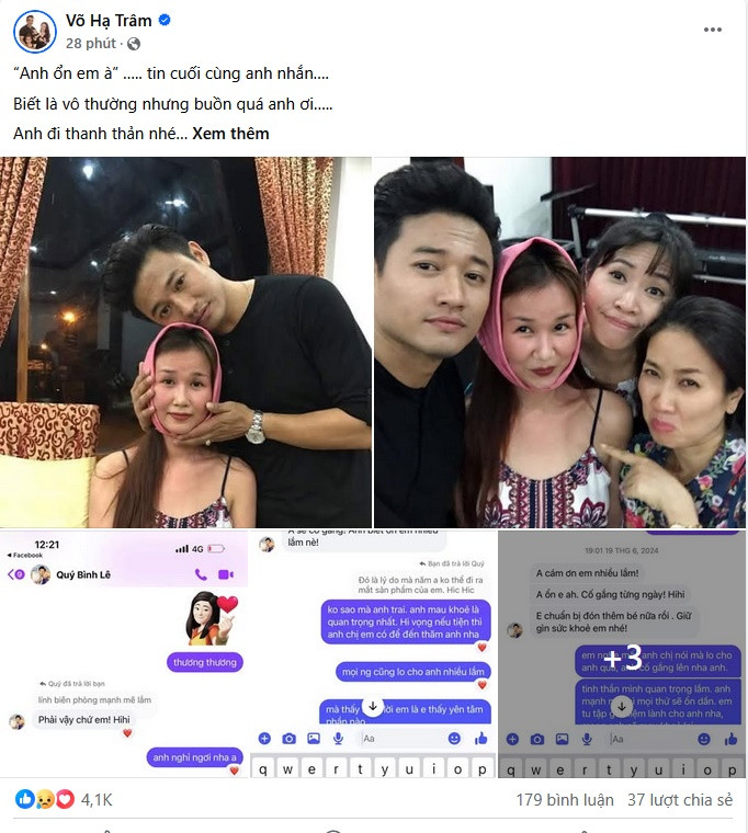 Cách đây ít phút, Võ Hạ Trâm đăng tải loạt ảnh bên người anh thân thiết kèm những đoạn tin nhắn cả hai nói chuyện trước khi nam diễn viên về nơi vĩnh hằng.
