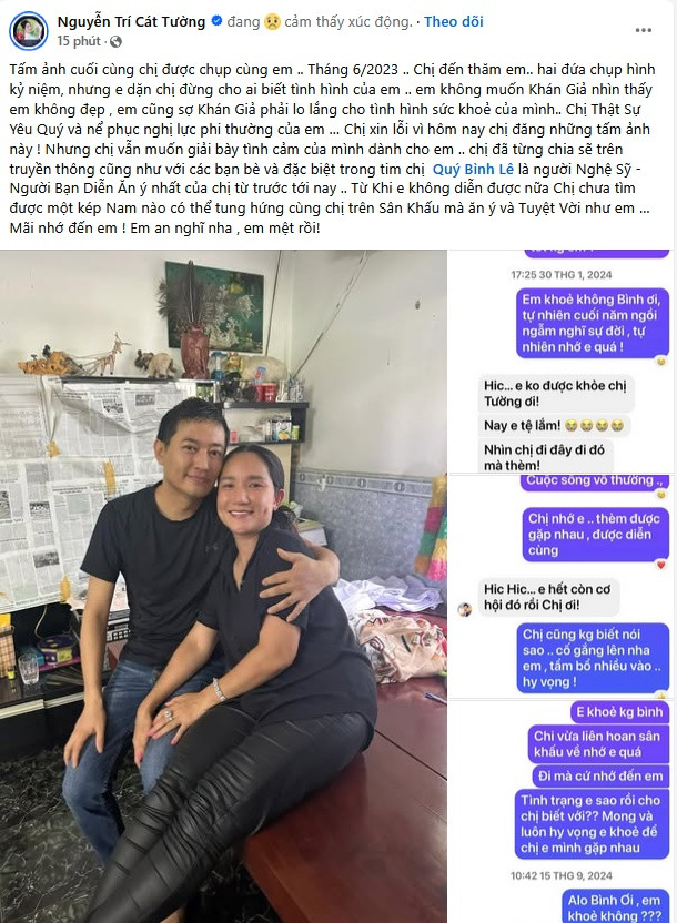 Trên trang cá nhân, nữ MC viết: "Tấm ảnh cuối cùng chị được chụp cùng em. Tháng 6/2023, chị đến thăm em, hai đứa chụp hình kỷ niệm, nhưng em dặn chị đừng cho ai biết tình hình của em.