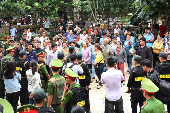 Sau khi tòa tuyên án, gần trăm người thân của các bị cáo đứng vây trước cửa ra vào phòng xử án, buộc lực lượng chức năng phải đưa bị cáo rời tòa bằng cổng sau.