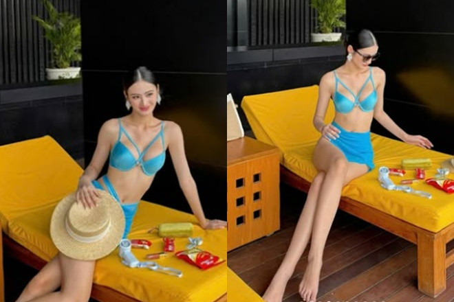 Mới đây, nàng hậu gây chú ý khi lần đầu đăng tải khoảnh khắc khoe body với bikini kể từ khi sang Ấn Độ. Diện bộ đồ bơi 2 mảnh màu xanh mát mắt, người đẹp tự tin "thả dáng" tại hồ bơi.