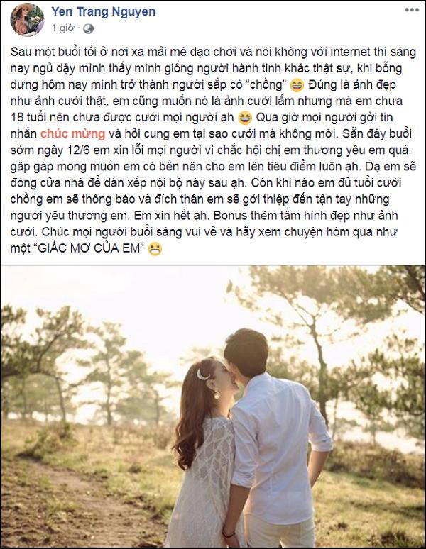 Còn khi nào em đủ tuổi cưới chồng em sẽ thông báo và đích thân em sẽ gởi thiệp đến tận tay những người yêu thương em. Em xin hết ạ. Bonus thêm tấm hình đẹp như ảnh cưới. Chúc mọi người buổi sáng vui vẻ và hãy xem chuyện hôm qua như một giấc mơ của em", nữ ca sĩ viết.