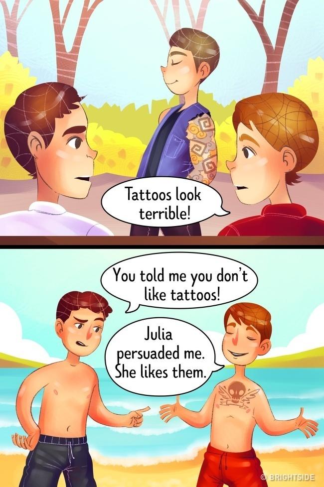 Nếu bạn đột nhiên bắt mình làm cái gì đó bạn không bao giờ làm trước đó chỉ vì người ấy gây áp lực cho bạn, thì đây là một dấu hiệu xấu. Thay thế niềm tin của bạn với đối phương có nghĩa là bạn đang mất đi một phần của bản thân và bạn không thực sự biết mình là ai. Bạn không nên đồng ý hay hoàn toàn tin tưởng mọi lời nói của người ấy. Bạn sẽ trở thành cái bóng của đối phương và họ sẽ không còn hứng thú với bạn.