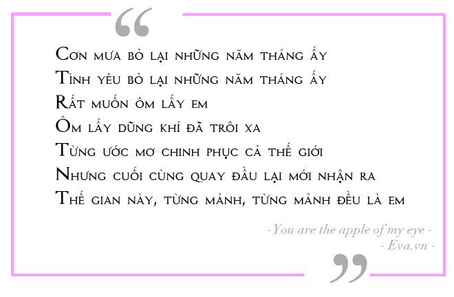 7 năm...để hôm nay tao nhận ra, tao đã mất mày, mất mày mãi mãi. Hôm nay tao mới hiểu thế nào là cười trong nước mắt. Chợt nhớ đến bộ phim "You are apple of my eyes", sao nó giống chuyện của tao và mày đến thế. 26 tuổi, mày đã có một công việc ổn định, có thể lo cho gia đình. 26 tuổi, tao cũng đã có một sự nghiệp cho riêng mình.